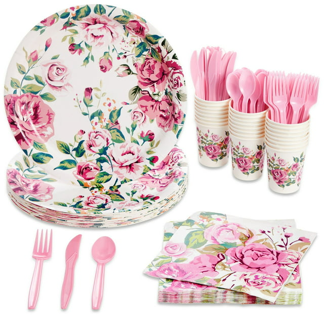 Throw the perfect spring garden party or family picnic with this all-in-one decorative flower party supplies set that includes 24 paper plates, plastic silverware, 9-ounce paper cups, and dinner napkins. Our tea party plates and cups disposable sets feature light pink roses set against a white background to add a fun and cohesive theme throughout your watermelon-themed party. Add this 144-piece disposable tableware set to your summer party decorations and supplies for a quick and easy cleanup when the celebration is over. This party supplies pack is made from durable and sturdy paper material, so you can carry around appetizers, desserts, and main courses without fear of your plates folding and creating a mess. In this bulk pack, you will receive enough napkins, paper plates, cups, plastic spoons, forks, and knives for 24 people. So whether you're hosting a girl's baby shower, a bridal shower, or a summer tea party, our tableware set is the perfect way to add a touch of fun and excitement to your flower theme party decorations. Warning. Do not microwave.