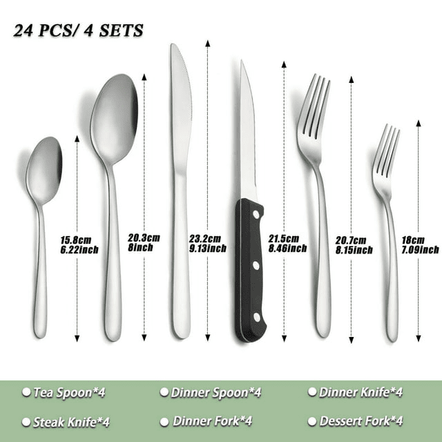[serve for 4] the 24-piece silverware set contains 4 extra steak knives than the regular cutlery, which is essential for families or restaurants. So you don’t need to buy another steak knives to use. What’ more, the premium steak knives with serrations make it easy to slice steaks or other meat.