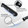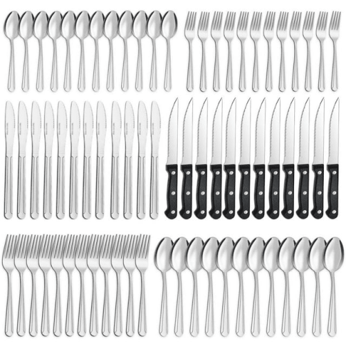 [great value with 12 steak knives]the 72 pieces flatware sets include 12 additional steak knives that you don't need to buy separately. The steak knives sharp serrations are easy to slice steaks or disassemble a turkey. At the same time, the handle of the steak knife is round and the arc design is ergonomically that make the steak knife is comfortable to hold when cutting.