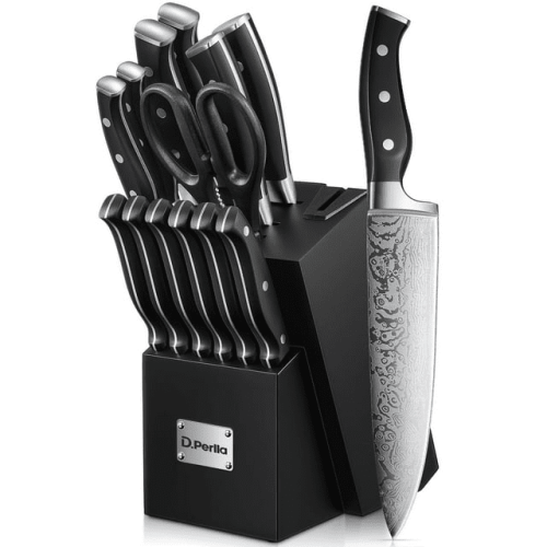 Home > D.Perlla Knife Set, 14PCS German Stainless Steel Kitchen Knives Block Set with Built-in Sharpener, Black
