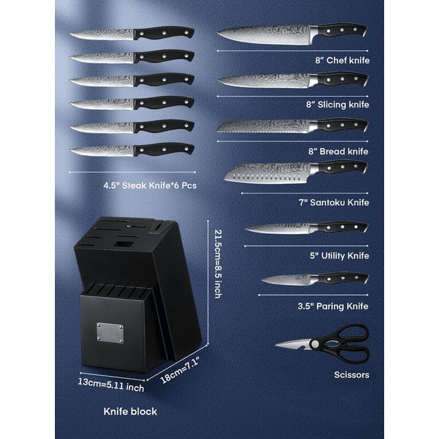 Including 8' chef knife, 8' slicing knife, 8' bread knife, 7' santoku knife, 5' utility knife, 3.5' paring knife, 6* 4.5' steak knives, plus pull-apart kitchen shears and a self sharpening storage block.