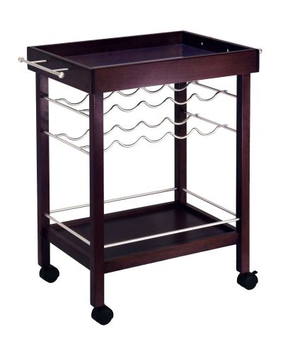 The Johnnie Bar Cart holds everything necessary for a portable bar with plenty of wine bottle and glass storage. A total of 10 bottles fit in the two row satin nickel finish wire rack and the bottom shelf is lined with matching wired guards to keep things from going over the edge. The cart has an overall size of 30.7"W x 18.3"D x 33.1"H and a shelf clearance to the bottom wine rack is 13.98". The bottom shelf has dimensions of 18.6" L x 14.1"W. Made of a solid and composite wood in a dark espresso finish. Assembly required.Bar Cart assembled size is 30.7"W x 18.3"D x 33.1"H.Bottom Shelf inside dimension is 18.6" x 14.1" x 14" ClearanceMetal is zine alloy with satin nickel. Solid/Composite wood in Espresso Finish. Assembly Required.nullnullnull This product meets the oversized requirement per UPS/FedEx. The shipping weight reflected is the dimensional weight. This product also meets the large package requirement per UPS/FedEx. The estimated shipping cost will include this fee. Large package is $70.00; applied when length plus girth [(2 x width) + (2 x height)] combined exceeds 130 inches. Additional Handling charge of $10.50 applied where a package's longest side exceeds 48 inches in length; the second longest side exceeds 30 inches in length; or total weight is greater than 70 lbs.This product meets the oversized requirement per UPS/FedEx. The shipping weight reflected is the dimensional weight. This product also meets the large package requirement per UPS/FedEx. The estimated shipping cost will include this fee. Large package is $70.00; applied when length plus girth [(2 x width) + (2 x height)] combined exceeds 130 inches. Additional Handling charge of $10.50 applied where a package's longest side exceeds 48 inches in length; the second longest side exceeds 30 inches in length; or total weight is greater than 70 lbs.