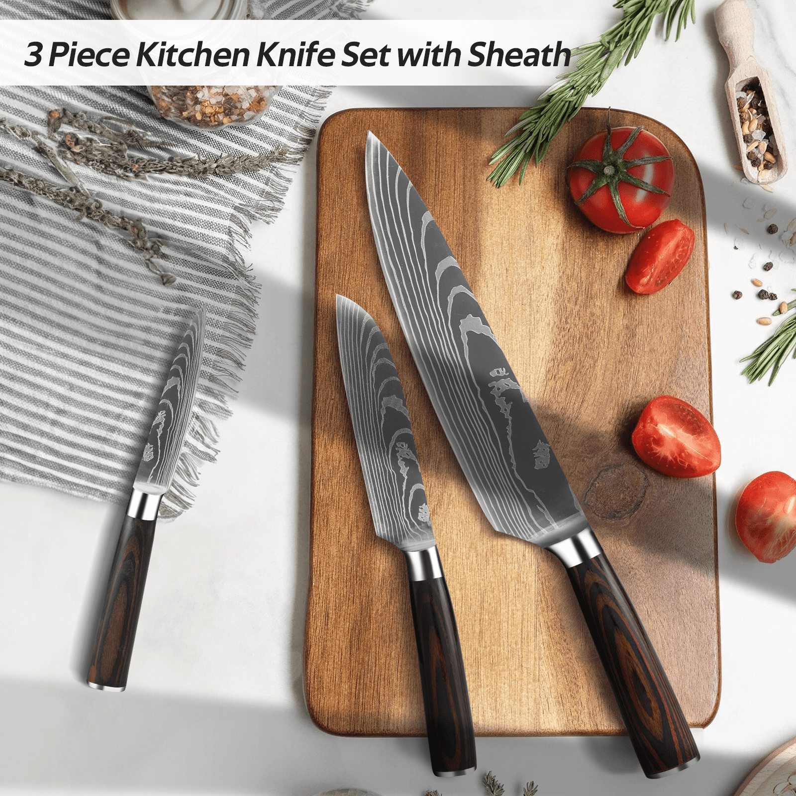 This oserlo knife set includes three high-quality kitchen knives designed to cater to a variety of culinary tasks. The set comprises a chef's knife for slicing and utility perfect for handling a range of meats, vegetables and fruits, and a paring knife for peeling and precision work. Crafted from premium stainless steel, these knives boast superior sharpness and durability. The ergonomically designed handles offer comfortable grips, allowing you to effortlessly tackle various cooking challenges. A must-have in any kitchen, this three-piece knife set caters to both home cooks and professional chefs. With this set, you'll have versatile cutting solutions that enhance convenience and efficiency in your culinary endeavors.