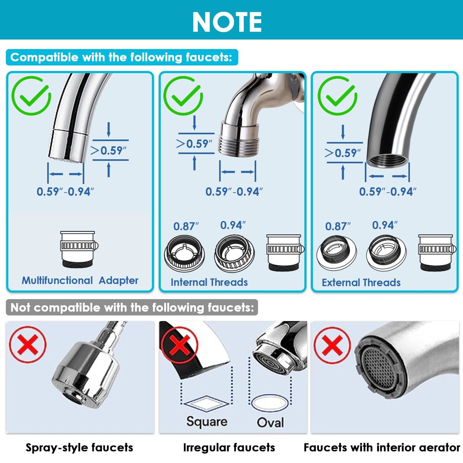• : With the product video and instruction, you can easily install the faucet filter in minutes. The package comes with 5 adapters ( 0.87" & 0.94" internal threads, 0.87" & 0.94" external threads, and a multifunctional adapter), which fits most standard faucets. The 5th image details the compatibility of this sink faucet filter. Please read the picture carefully before buying to make sure this product is suitable for your faucet.