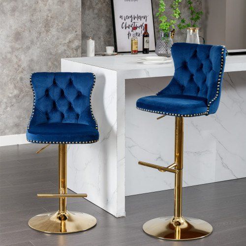 Product Name:A&A Furniture,Golden Swivel Velvet Barstools Adjusatble Seat Height from 25-33 Inch, Modern Upholstered Bar Stools with Backs Comfortable Tufted for Home Pub and Kitchen Island,Blue,Set of 2