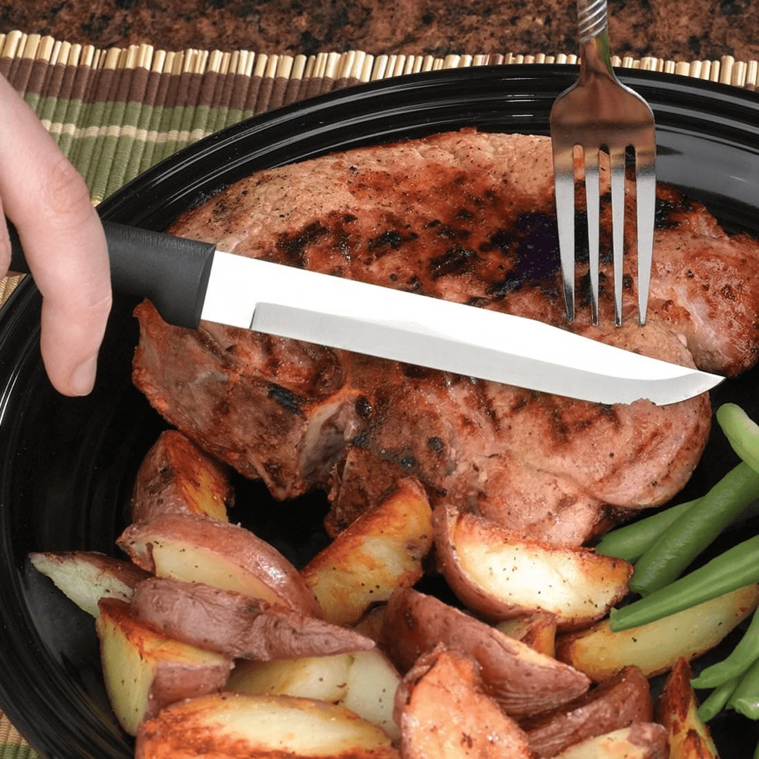 The rada cutlery g206 utility steak knives gift set makes a great gift for weddings, birthdays, anniversaries and much more. You’ll be so impressed with the design and functionality that you will want to purchase your own set to have in your kitchen. These stainless steel knives come in a set of 6. The blade measures approximately 4-3/4 inches and each knife has an overall length of 8-1/2 inches. Use these knives in the kitchen when preparing dinner or use them at the dinner table. These knives feature a longer, non-serrated blade than our serrated steak knife. Not only are these knives beautiful and elegant, but sharp and ultra durable. The handles are comprised of a black stainless steel resin that can be washed in the dishwasher. Hand washing fine cutlery is recommended but handle is dishwasher tolerant. They have just the right thickness for comfort and performance. They come beautifully boxed with a form-fitted flocked insert holding them securely in place, so you can wrap them and give as the perfect gift. Rada mfg. Co. Is located in waverly, iowa and has been manufacturing cutlery in the usa since 1948. Our mission is all about 'providing our customers the best value of kitchen knives for their dollar.' we stand by our craftsmanship. Rada mfg. Co. Will replace any product manufactured by our company returned to us due to defects in material or workmanship. Buy this 6 piece knife set for yourself or as a gift and start cooking!